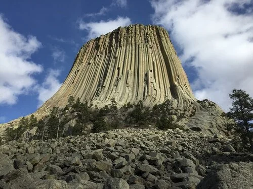 Last week Cianan and I were able to visit Devil's Tower in eastern Wyoming. It was amazing to crest a grassy hill and observe this incredible, 867 foot tall, geological feature appear on the horizon more than 15 miles away! It was like a visual magnet, holding our attention as we traveled toward it. It was even more impressive when we arrived at the ranger station to hike around the circumference of the tower.